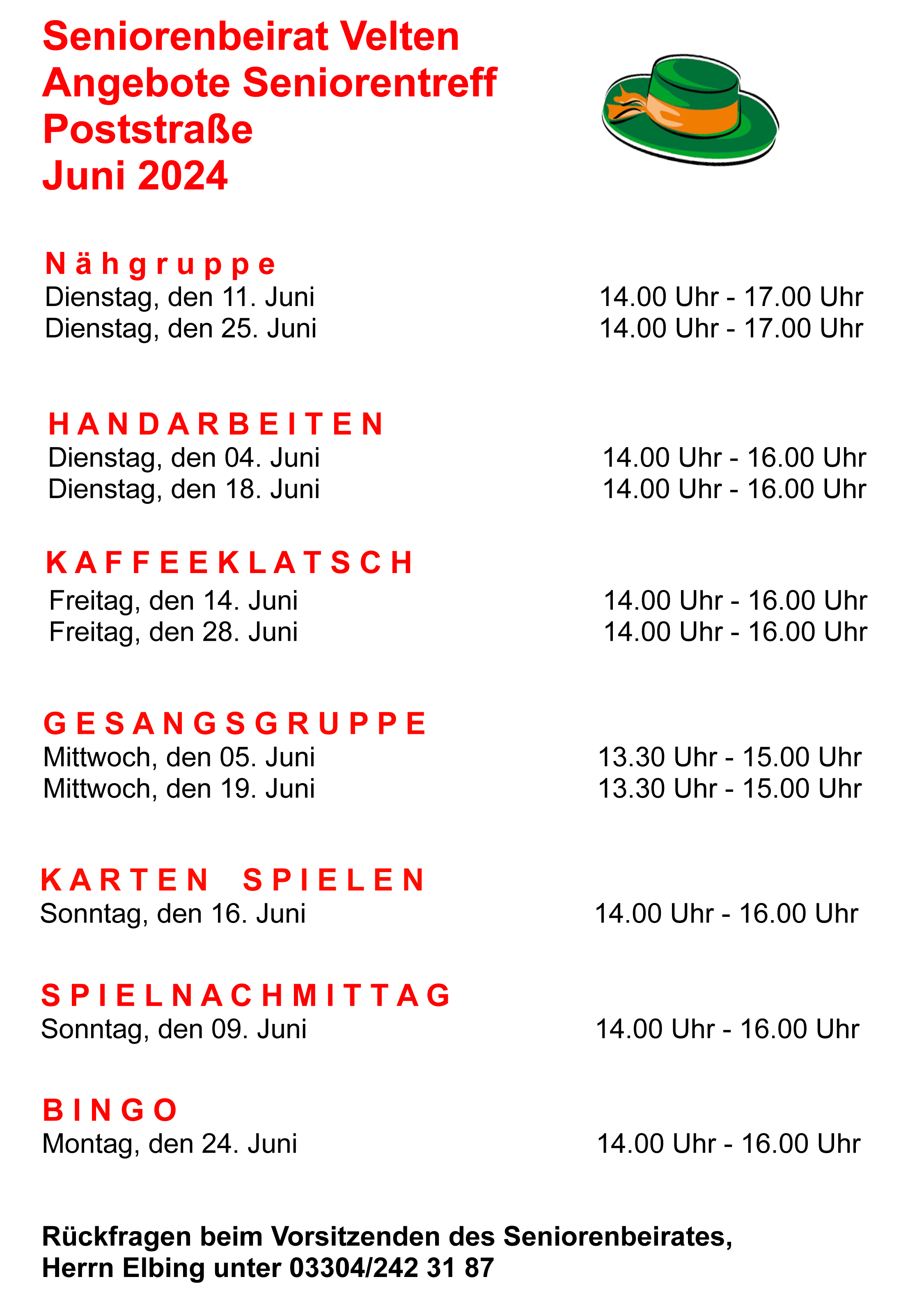 Dank der „Seniorengemeinschaft Velten e. V.“ kann im Treff ein breites Spektrum an regelmäßigen Aktivitäten angeboten werden. Hierzu zählen unsere beliebten Bingonachmittage sowie die musikalischen Treffen der Gesangsgruppe „Veltener Singdrosseln“.