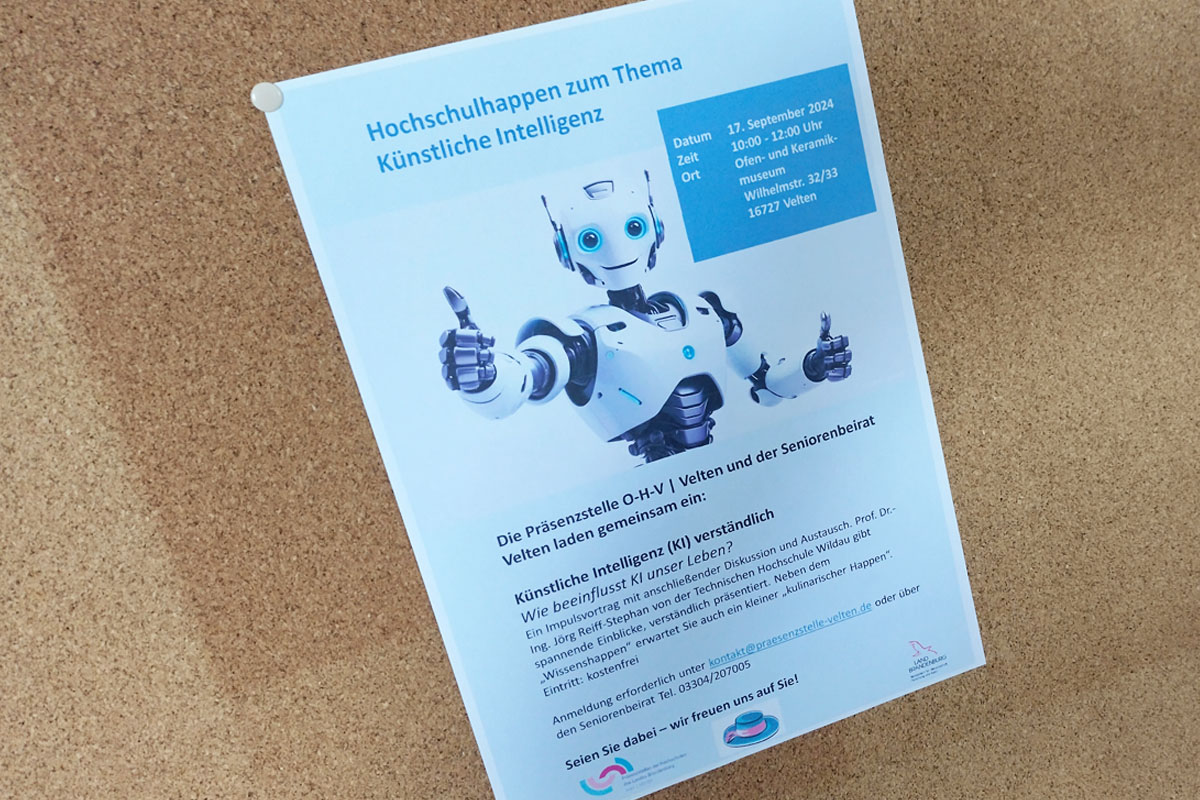 Die Präsenzstelle O-H-V | Velten und der Seniorenbeirat Velten freuen sich, Sie zur Veranstaltung „Hochschulhappen: Künstliche Intelligenz verständlich – wie beeinflusst KI unser Leben?“ einzuladen. Diese findet am 17. September 2024 von 10:00 bis 12:00 Uhr im Ofen- und Keramikmuseum Velten, Hedwig Bollhagen Museum, Wilhelmstraße 32/33, 16727 Velten, statt.