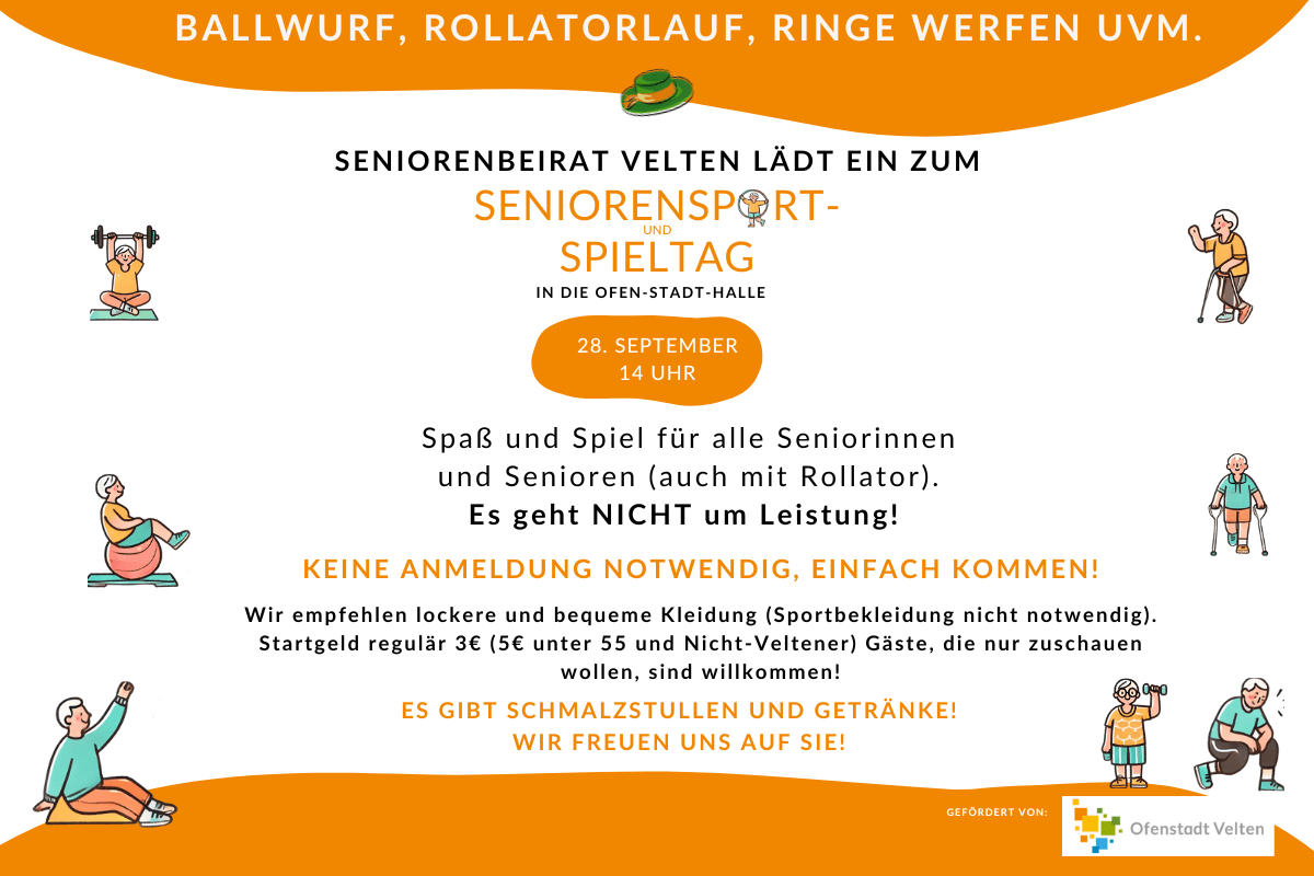wir vom Seniorenbeirat der Stadt Velten laden Sie herzlich zu unserem lustigen Seniorensport- und Spieltag ein, der am Samstag, den 28. September 2024, in der Ofen-Stadt-Halle Velten stattfindet. Startschuss ist um 14:00 Uhr.