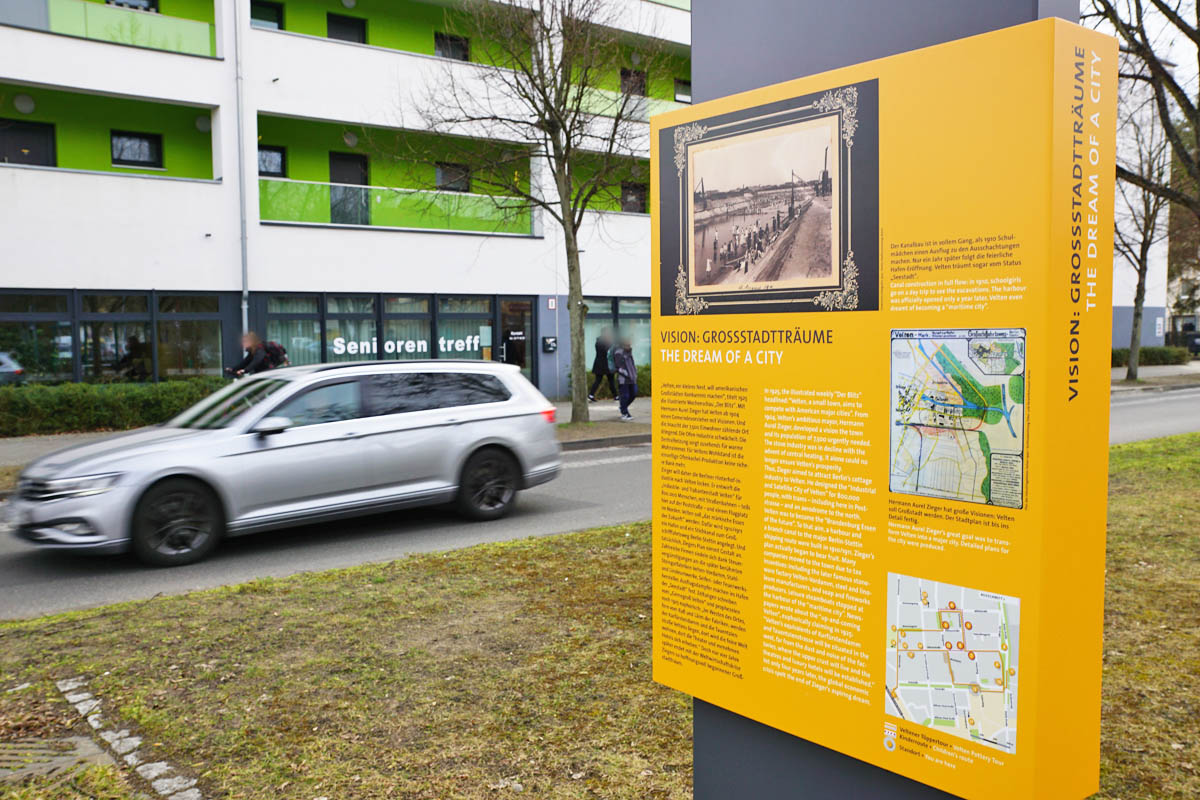Wer hier vorbeikommt, steht mitten in der Geschichte. Denn obwohl die Veltener Töppertour am Bahnhof beginnt, erzählt diese Stele ein ganz besonderes Kapitel: Von großen Hoffnungen, vom Leben der Menschen in einer aufstrebenden Industriestadt – und davon, wie aus dem einst beschaulichen Velten eine Stadt mit echten Großstadtambitionen wurde.
