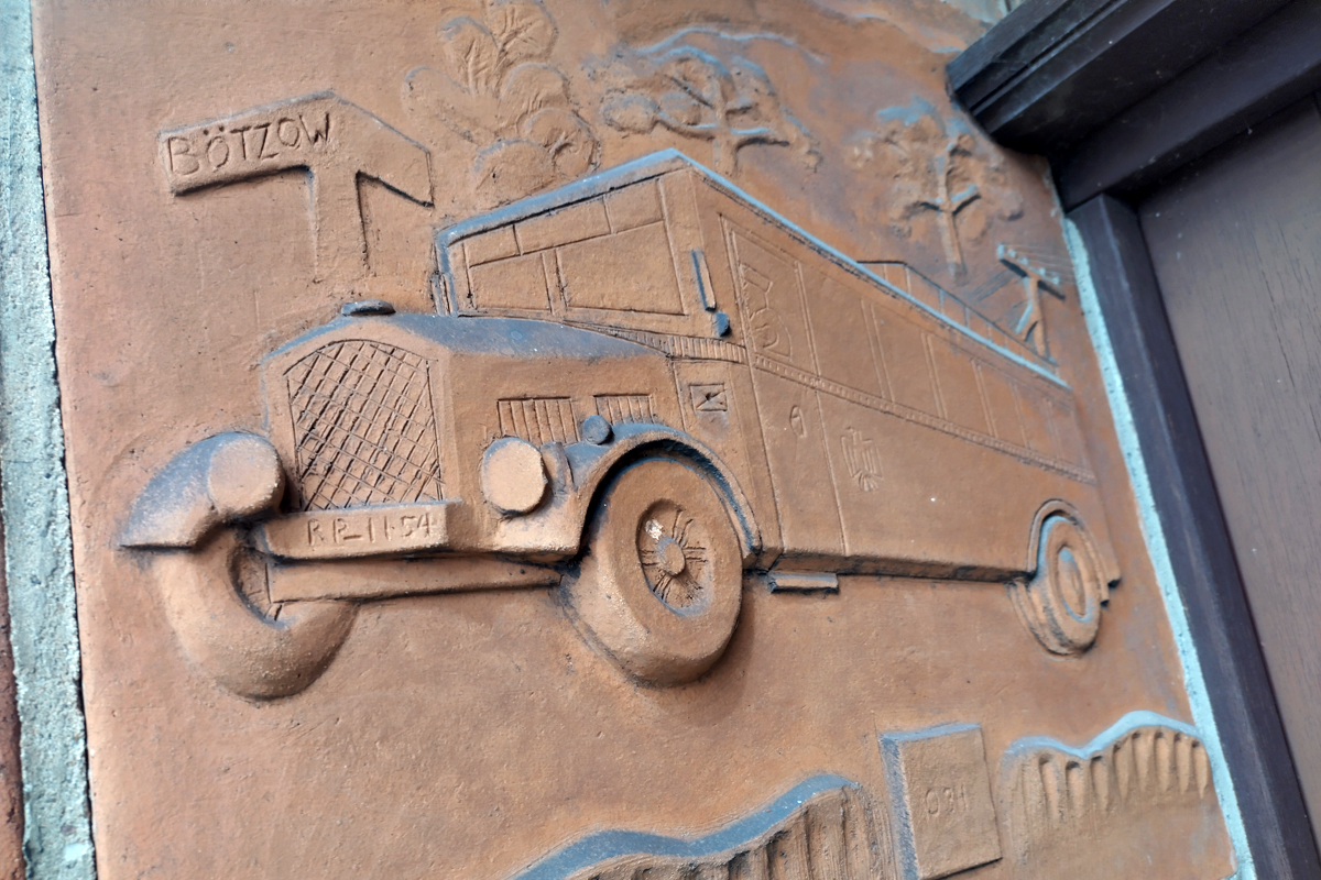 Wer mit dem Zug in Velten ankommt, sieht sie sofort: die ehrwürdige alte Post direkt gegenüber vom Bahnhof. Ein massiver Bau mit verputzter Fassade, Walmdach und auffälligen roten Ziegelrahmen um die Fenster. Über dem Eingang: kunstvolle Reliefs aus Keramik, die an den Postverkehr der frühen Jahre erinnern – inklusive Postauto, Fahrer in Uniform und dem Zielort „LINUM“ auf einer kleinen Flagge, dem nördlich gelegenen Storchendorf. Die Jahreszahl 1931 ziert stolz die Eingänge.