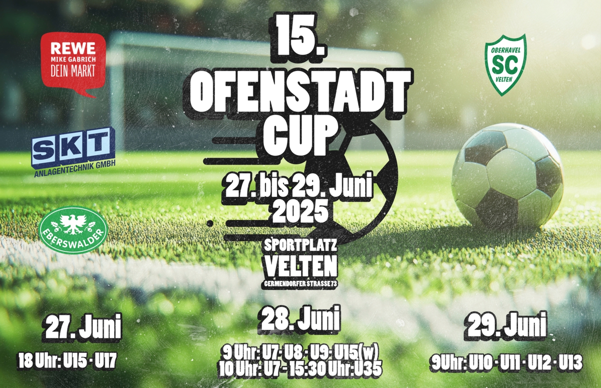 Vom 27. bis 29. Juni 2025 lädt der SC Oberhavel Velten wieder zum traditionsreichen Ofenstadt Cup ein – inzwischen bereits in der 15. Auflage. Der Sportplatz an der Germendorfer Straße wird an diesem Wochenende zum Treffpunkt für junge Fußballerinnen und Fußballer sowie zahlreiche Fans des Vereins.