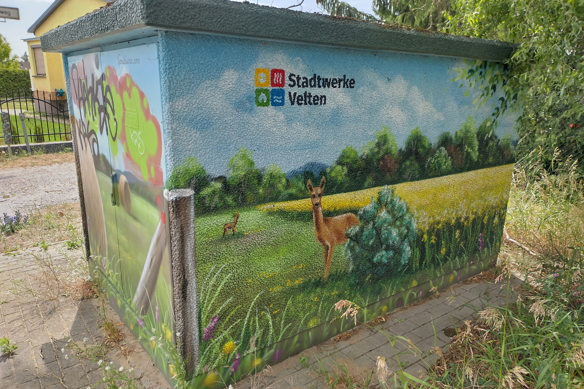 Bei einem Spaziergang durch Velten fiel einem aufmerksamen Senior ein besonders schön gestalteter Stromkasten ins Auge – ein kleines Kunstwerk mitten im Grünen. Die ländliche Szene mit Rehen auf einer blühenden Wiese, im Hintergrund Felder, Wälder und ein weiter Himmel, wirkt fast wie ein Gemälde im Freien. Dezent eingebettet: das Logo der Stadtwerke Velten, die dieses Werk offenbar in Auftrag gegeben haben.
