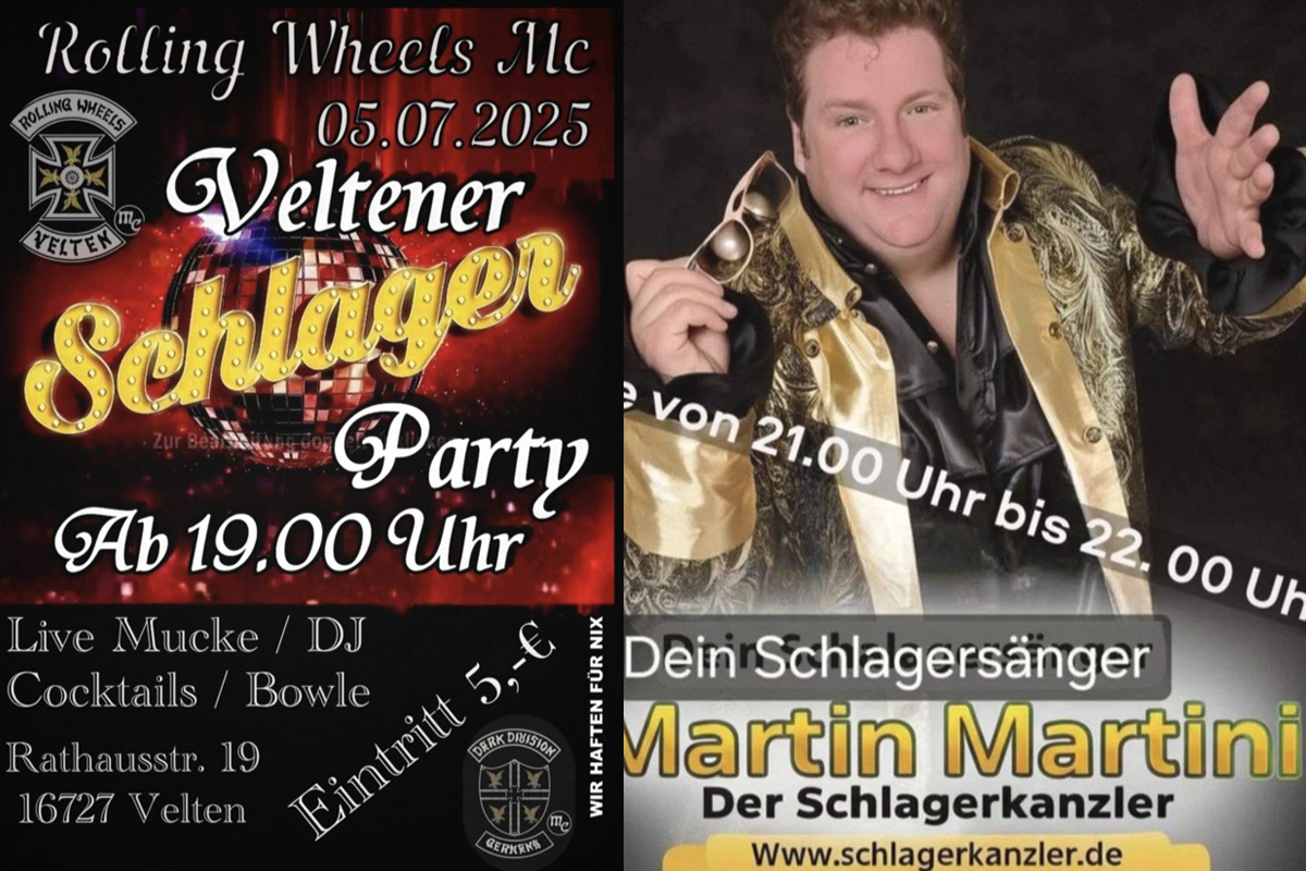 Am Sonnabend, den 5. Juli 2025, lädt der Rolling Wheels MC Velten zur großen Schlagersause in die Rathausstraße 19 ein. Ab 19 Uhr wird der Hof zur Tanzfläche – mit Live-Musik, DJ, Cocktails, Bowle und bester Gesellschaft.