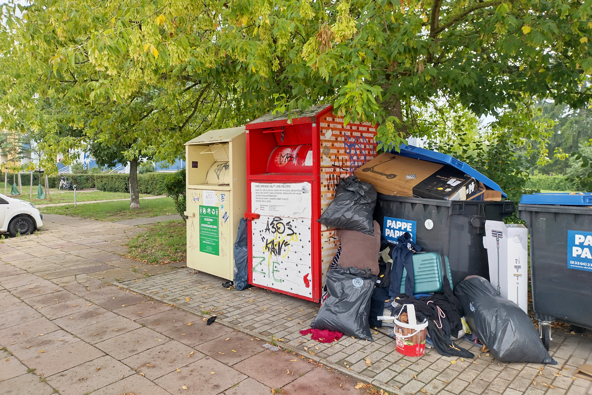 Besonders unerquicklich wird es bei den Altkleidern. Wenn die Container voll sind oder nichts mehr hineinpasst, werden Säcke und Kleidungsstücke oft einfach daneben abgestellt. Das mag im ersten Moment noch nach guter Absicht aussehen. In der Praxis bedeutet es aber meist: Regen, Schmutz, Wind, im Zweifel aufgerissene Beutel und am Ende doch nur Müll. Mit Spende hat das dann nicht mehr viel zu tun.