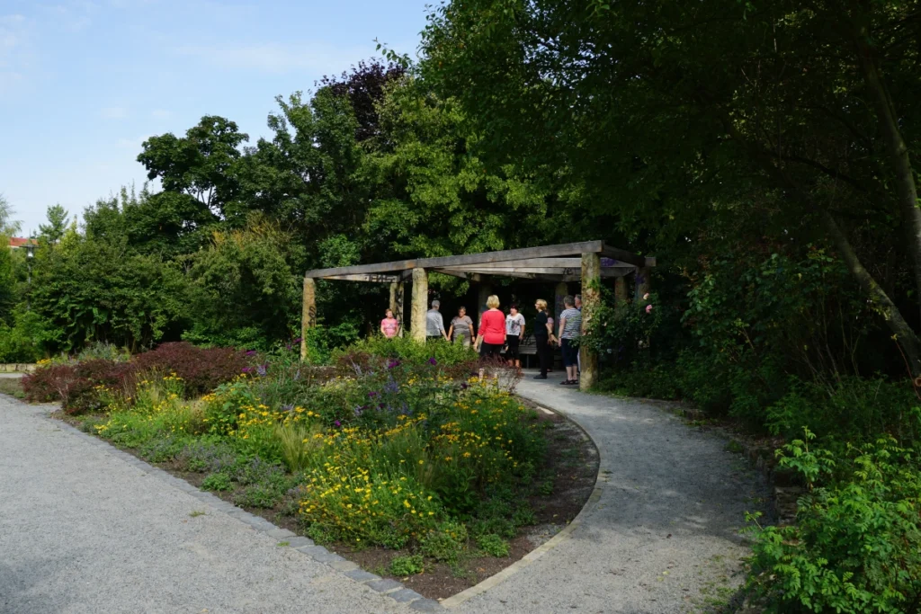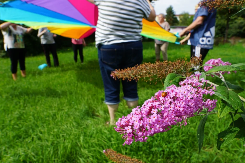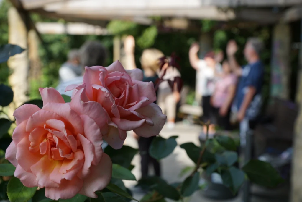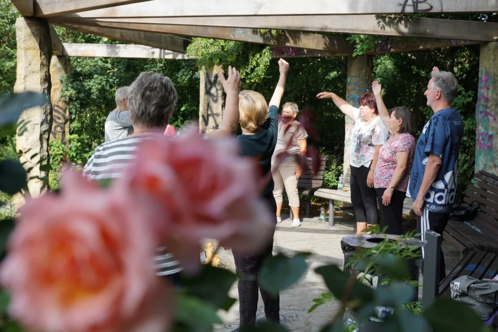 Ich wollte eigentlich in den Raum 1.4. Dort trifft sich die Tai-Chi-Gruppe laut Plan. Doch der Raum ist heute leer. Kein Flüstern, kein Stühlerücken. Stattdessen höre ich etwas anderes: eine leise Melodie, fernöstlich, wie aus einem Film, in dem Kirschblüten vom Himmel fallen. Also folge ich dem Klang, über den Weg am Blumenbeet entlang. Und da sind sie: neun Menschen, unter einer Pergola, umgeben von Schmetterlingen, die sich nicht entscheiden können, welche Blüte heute die schönste ist.