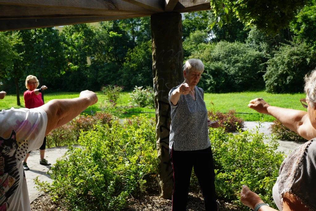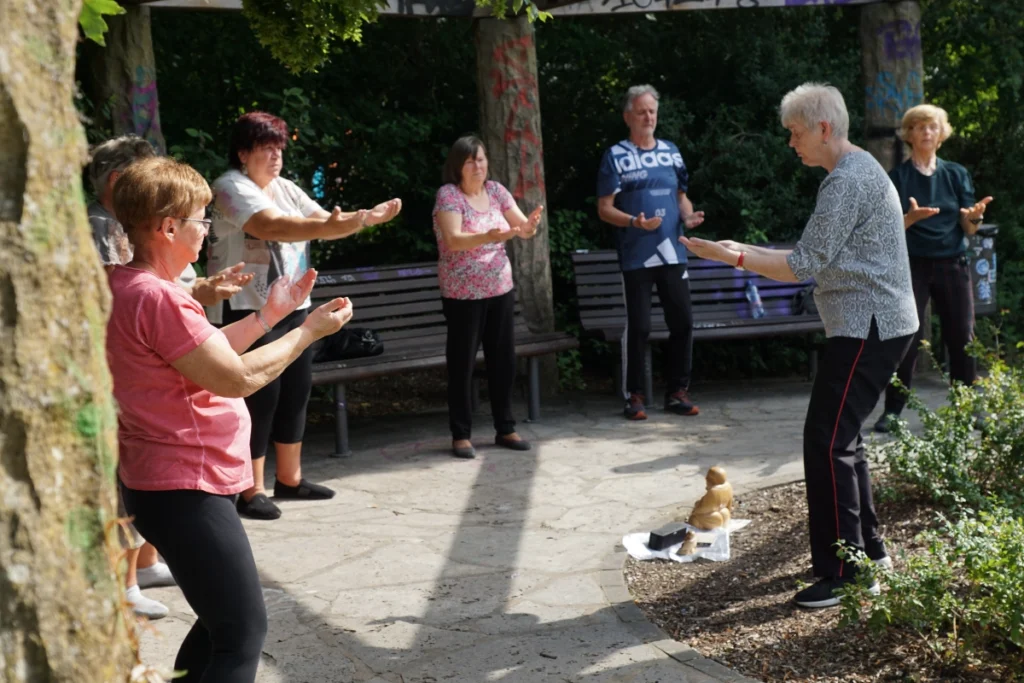Martina leitet an. Ihre Stimme ist ruhig, ohne Eile. „Wir putzen jetzt mal die Fenster.“ Niemand denkt an Putzlappen. Alle Arme bewegen sich in großen, kreisenden Bahnen, als würden unsichtbare Scheiben klarer und klarer. Dann kommt die „Sanduhr“ – Arme drehen sich, das Gewicht verlagert sich von links nach rechts und wieder zurück. Später wird ein „Seil gezogen“. Alles in Bildern, die sofort ins Herz gehen. Man muss nicht wissen, wie die Bewegungen in China heißen – es reicht, dass sie sich gut anfühlen.