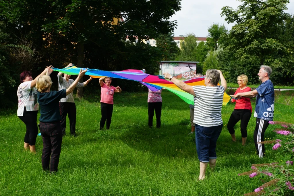 Die Gruppe steht locker, so wie man steht, wenn man weiß, dass gleich etwas Gutes passiert. Fast alles Frauen, ein Mann – Wolfgang – mittendrin. Er lächelt viel. Martina, die Leiterin, steht vorne. Seit sieben Jahren bringt sie diese sanfte Bewegungskunst in die Region, leitet mehrere Gruppen. Ihre Ausbildung hat sie im Kloster St. Marienstern nahe Bautzen gemacht. Und sie lehrt das Programm „Keep Moving“, das ursprünglich für Menschen mit Parkinson entwickelt wurde, heute aber Menschen jeden Alters bewegt – im besten Sinn.
