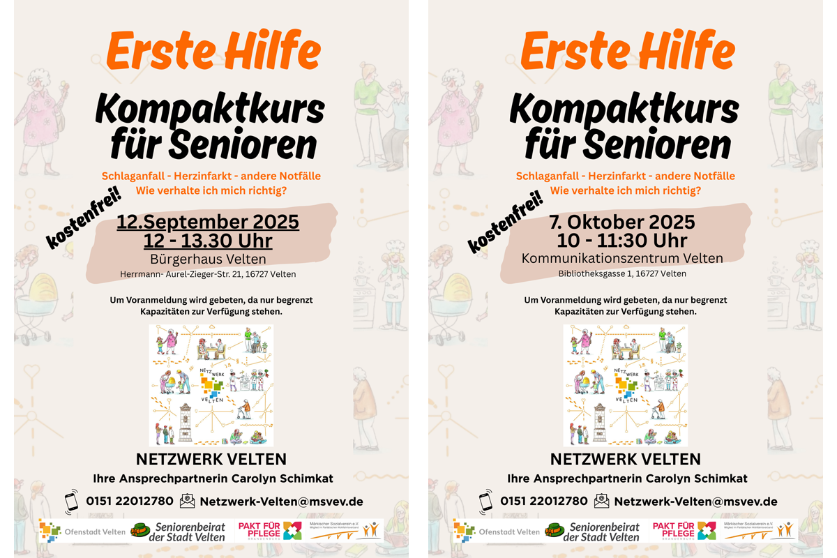 Das Netzwerk Velten lädt gemeinsam mit dem Seniorenbeirat der Stadt Velten zu zwei kostenfreien Kompaktkursen „Erste Hilfe für Senioren“ ein.