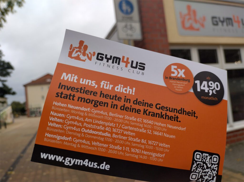 Manchmal fällt einem ein Flyer in die Hand, der neugierig macht. Orange, sportlich, mit großen Versprechen: „Nicht warten, sondern starten!“ heißt es bei Gym4Us, einem Fitnessstudio, das gleich zwei Standorte in Velten betreibt – einmal in der Poststraße und einmal draußen an der Berliner Straße. Auf dem Papier klingt das modern: Training zu jeder Tages- und Nachtzeit, flexible Mitgliedschaft, faire Preise. Doch lohnt sich das auch für ältere Menschen, die etwas für ihre Gesundheit tun möchten?
