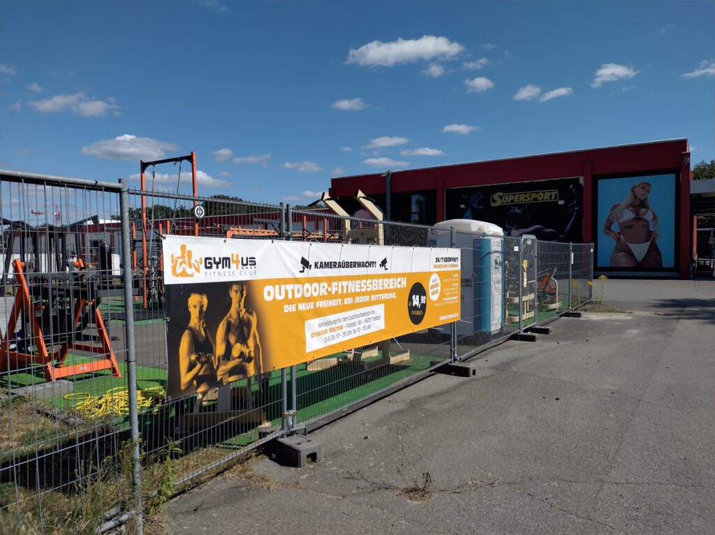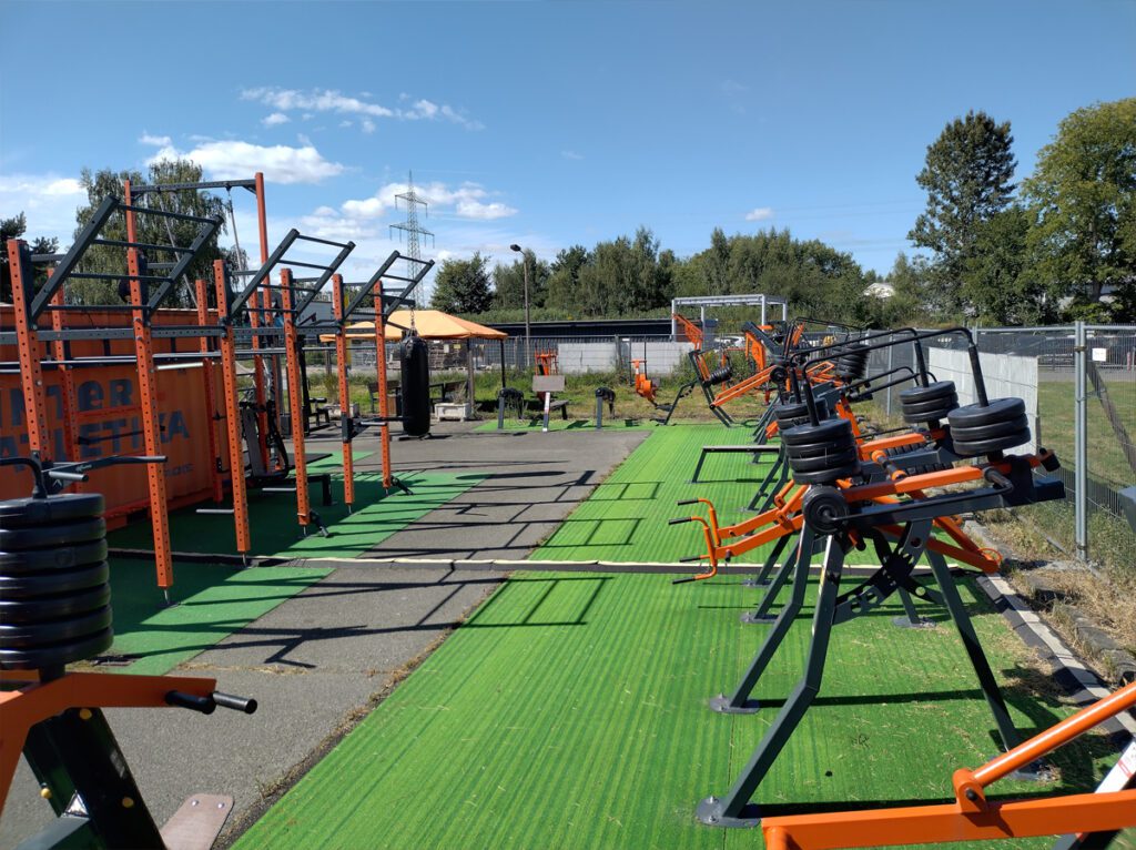 Der zweite Standort an der Berliner Straße ist ein Outdoor-Park mit schweren Geräten unter freiem Himmel. Hantelmaschinen, Reckstangen, ein Boxsack – alles robust und wetterfest, ein bisschen wie ein Trainingscamp im Sommer. Samstags zwischen 14 und 17 Uhr gibt es dort ein kostenloses Probetraining, bei dem Interessierte die Geräte ausprobieren und Fragen stellen können.