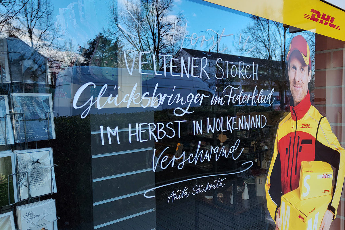 Dann blieb mein Blick am Schaufenster der DHL-Filiale hängen. Keine Werbung, keine Preisliste, kein üblicher Hinweis auf Öffnungszeiten oder Paketmaße. Stattdessen stand dort, mit Kreide geschrieben und in sauberer, fast feiner Schrift, ein Gedicht: