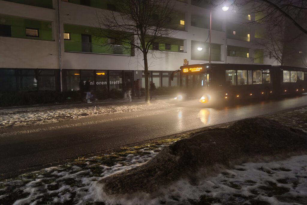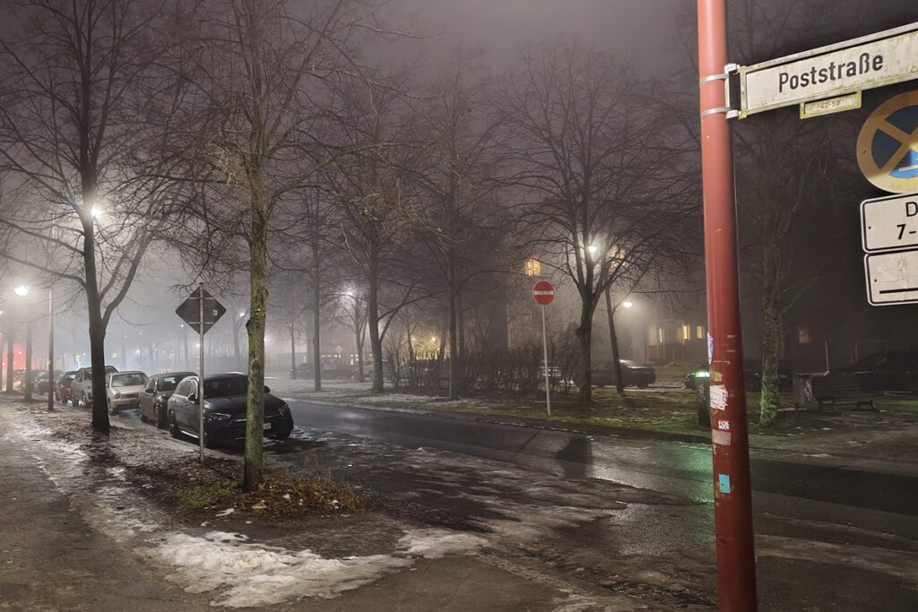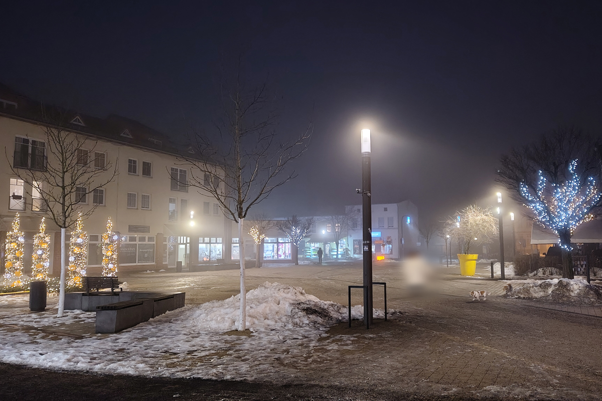Der Januar zeigt sich von seiner typischen Veltener Seite: feuchtkalt, leicht neblig, still. Über dem Marktplatz liegt ein milchiger Schleier, der das Licht der Laternen weich zeichnet und die Konturen der Häuser verschwimmen lässt. Der Boden ist nass, stellenweise noch mit alten Schneeresten bedeckt, die tagsüber angetaut und abends wieder angezogen haben.