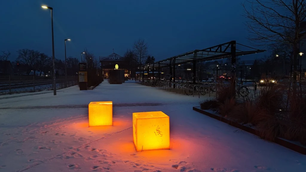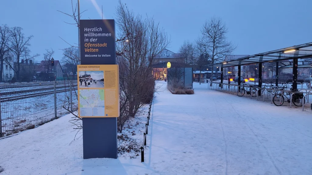 Abends liegt Ruhe über dem Vorplatz. Gedämpftes Licht, Schnee, breite Wege, klare Beschilderung: „Willkommen in der Ofenstadt Velten“. Eine weitere der 25 informativen Stelen der Töppertour. Man merkt schnell, dass dieser Bahnhof mehr ist als Haltestelle. Er ist Ankommen und Weitergehen zugleich – für Pendler, für Besucher, für Menschen aus der Umgebung. Genau hier sitzt Plentz richtig: sichtbar, erreichbar, mitten im Alltag. Und genau deshalb passt das Bild mit den Kreidetafeln so gut. Frühstück am Morgen, Wärme am Abend – eingebettet in einen Ort, der Bewegung kennt, aber nicht hektisch ist.