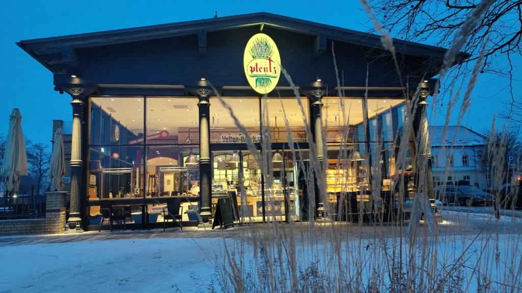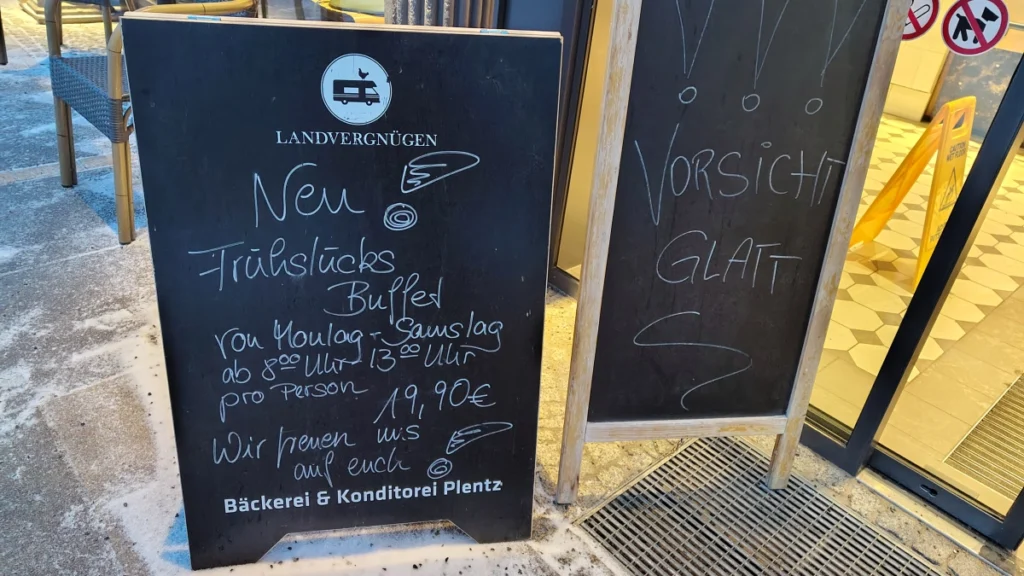Direkt am Eingang der Bäckerei & Konditorei Plentz stehen zwei Kreidetafeln. Links das Angebot, klar und handgeschrieben: Frühstücks-Buffet, Montag bis Samstag, ab 8:00 Uhr, bis 13:00 Uhr, 19,90 € pro Person. Rechts der nüchterne Hinweis: „Vorsicht glatt“. Klar, es ist winterlich am Bahnhof Velten bei einer weiteren Station des Kaffeehaus-Rundgangs durch Velten. Hier kommt die Bahn aus Richtung Henningdorf bzw. Berlin an, nein, nicht die S-Bahn, der RB fährt Richtung Kremmen und Busse binden die umliegenden Ortsteile an, Fahrräder stehen in Reihen unter dem Dach, Autos auf P-R und rollen auch langsam vorbei. Kein hektisches Durchgangschaos, sondern ein strukturierter kleinstädtischer Knotenpunkt.