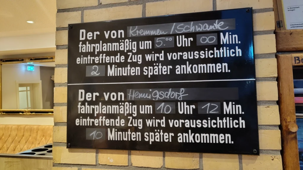 Der Bahnhof Velten (Mark) ist weit mehr als ein einfacher Haltepunkt. Er wurde bereits 1893 eröffnet und ist heute ein klassischer Durchgangsbahnhof an der Kremmener Bahn, der regelmäßig von Regionalzügen angefahren wird – beispielsweise der RE6 (Prignitz-Express) und der RB55, die Velten stündlich mit Hennigsdorf und weiter mit dem Berliner Verkehrsnetz verbinden. Das bedeutet: Pendler steigen hier aus, Buslinien (wie 807 und 824) ergänzen das Angebot, und Velten ist über den Verkehrsverbund Berlin-Brandenburg gut in Richtung Hauptstadt, aber auch Richtung Neuruppin/Prignitz erreichbar. Genau an diesem Ortskern – zwischen Bahnsteigen, Fahrradstellplätzen und Busanschlüssen – liegt Plentz: ein Treffpunkt für Menschen, die ankommen, verweilen oder auf dem Weg sind. Die Kreidetafel mit dem Frühstücksangebot wirkt hier natürlich, weil dieser Bahnhof ein Ort des Alltags ist – nüchtern, funktional und doch reich an Leben.