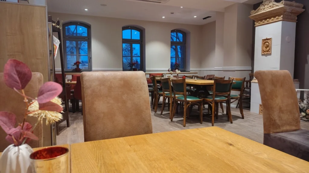 Die Raumaufteilung ist offen, aber klar. Größere Tische für Gruppen stehen selbstverständlich neben kleineren Sitzplätzen, ohne dass es nach Kantine wirkt. Alte Bahnhofselemente – Anzeigetafeln, Beschriftungen, architektonische Details – sind nicht museal ausgestellt, sondern selbstverständlich integriert. Man merkt: Hier wurde nicht „thematisch dekoriert“, sondern mit dem Bestand gearbeitet.