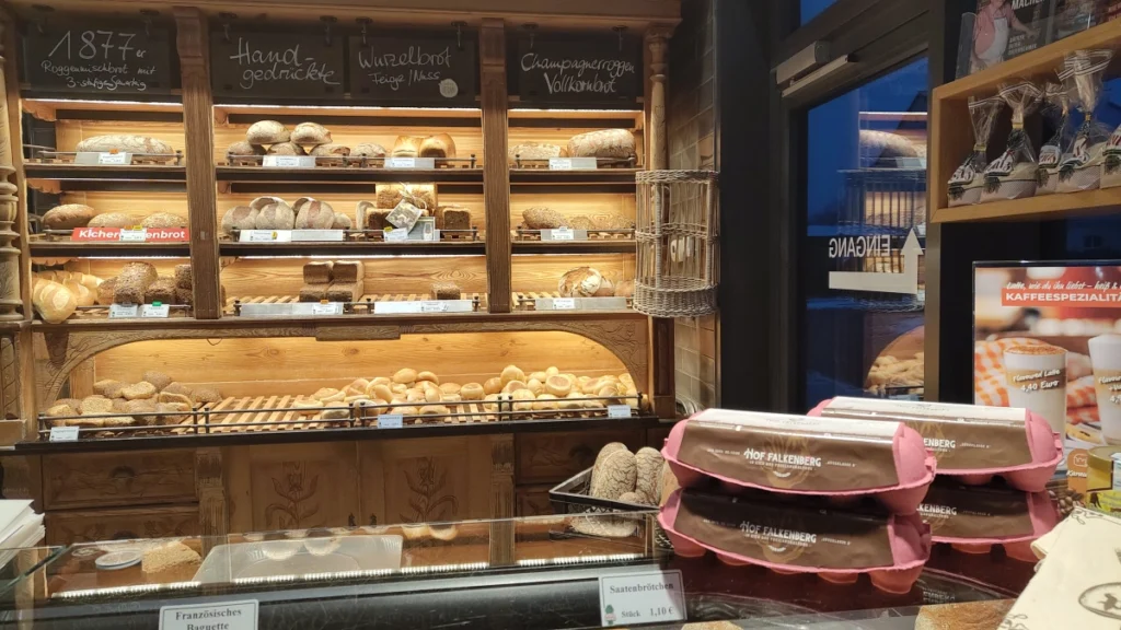 Ich war nicht morgens da, sondern am Abend. Trotzdem: Die Auslagen waren noch reich gefüllt. Brot, Brötchen, Kuchen – kein Restgefühl, kein Abbau. Das spricht für Planung und Handwerk. Man merkt, dass dieser Ort nicht nur auf den Frühstücksansturm ausgelegt ist, sondern den ganzen Tag trägt. Die Brotauslage war noch vollständig bestückt: große, rustikale Laibe, feinere Mischbrote, kräftige Roggenbrote und mehrere Sorten mit Saaten und Körnern. Nichts wirkte ausgesucht oder zusammengeschoben, sondern ordentlich präsentiert, fast wie am Vormittag.