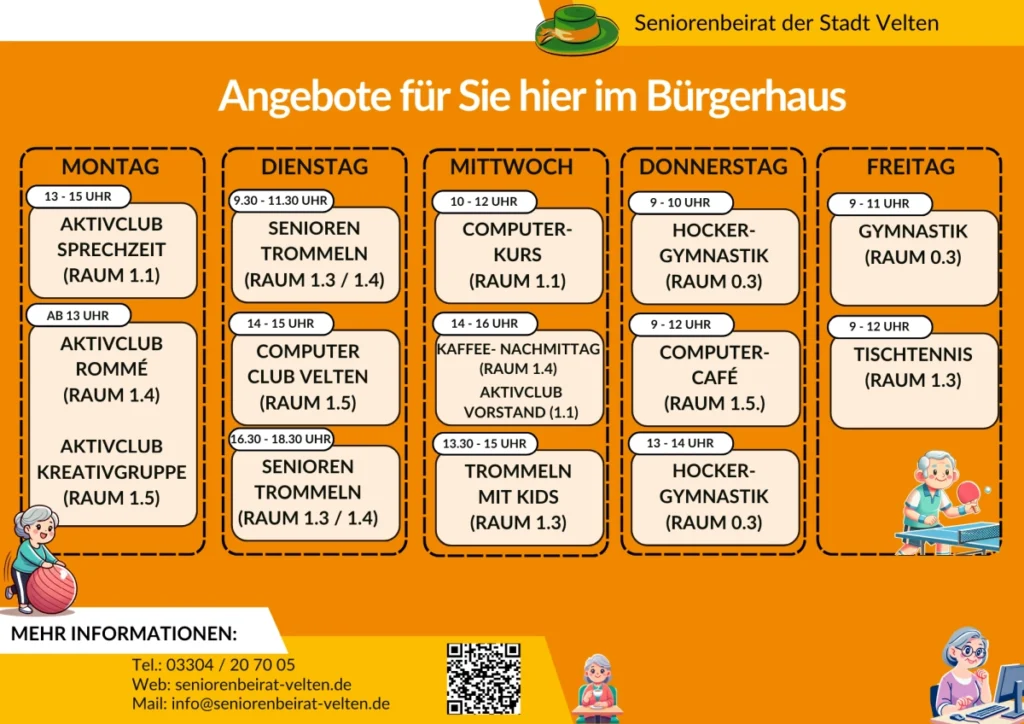 Alle Angebote richten sich an Menschen ab 55 Jahren. Eine Anmeldung ist nicht erforderlich.