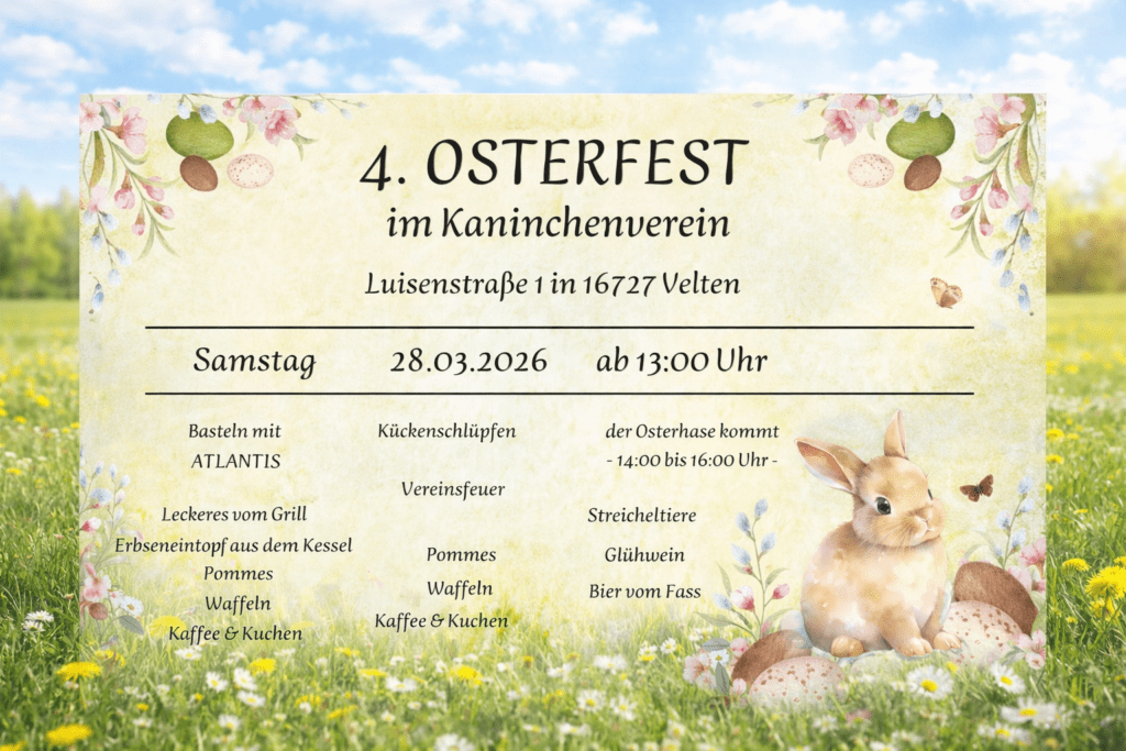 Wer also für den 28. März 2026 noch nichts vorhat und Lust auf einen bodenständigen, familienfreundlichen Nachmittag hat, sollte sich das 4. Osterfest im Kaninchenverein Velten vormerken. Los geht es ab 13 Uhr in der Luisenstraße 1. Besonders für Familien mit Kindern dürfte sich ein Besuch lohnen – schon allein wegen der Tiere, des Osterhasen und der vielen kleinen Programmpunkte, die aus einem einfachen Sonnabend einen schönen Frühlingsnachmittag machen können.